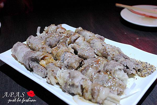 每一片五花肉片捲著不同的食材:青蔥、洋蔥、泡菜、金針菇,