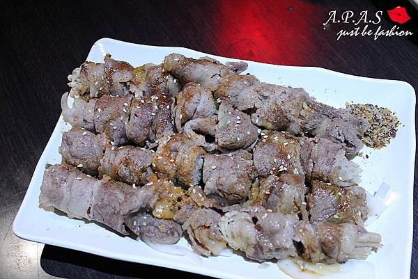 由瘦至肥排列的烤大腸中間都夾著爽口的蔥,