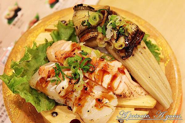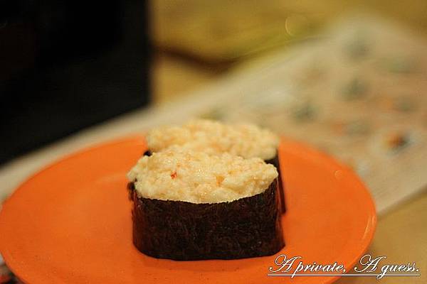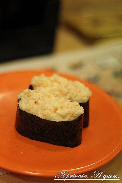 龍蝦沙拉,轉盤上的軍艦,海苔居然還有一點脆度,沒有完全軟掉。龍蝦沙拉的部份比較失望,美乃滋太多,壞了平衡。