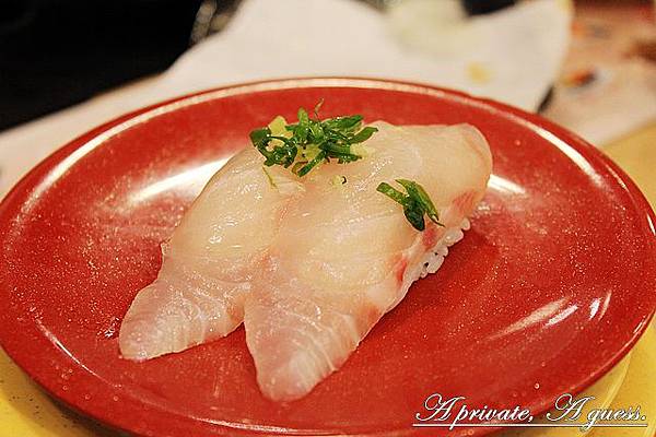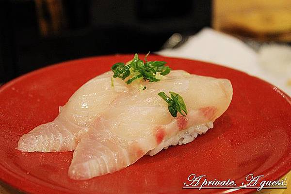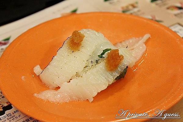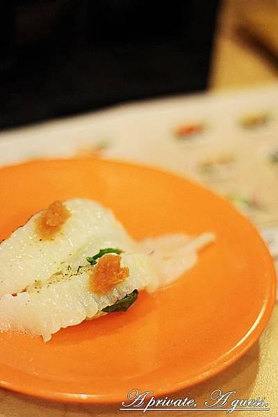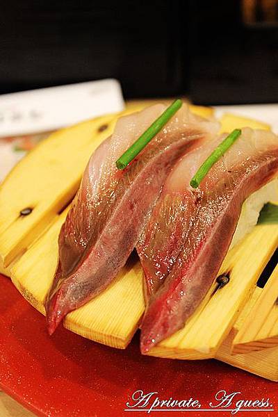 炙比目魚鰭邊肉,整個盤子都是油,好在魚肉下墊了紫蘇葉。我是不喜歡紫蘇味道的人,這兩貫卻深深覺得紫蘇葉解膩的功效真好。